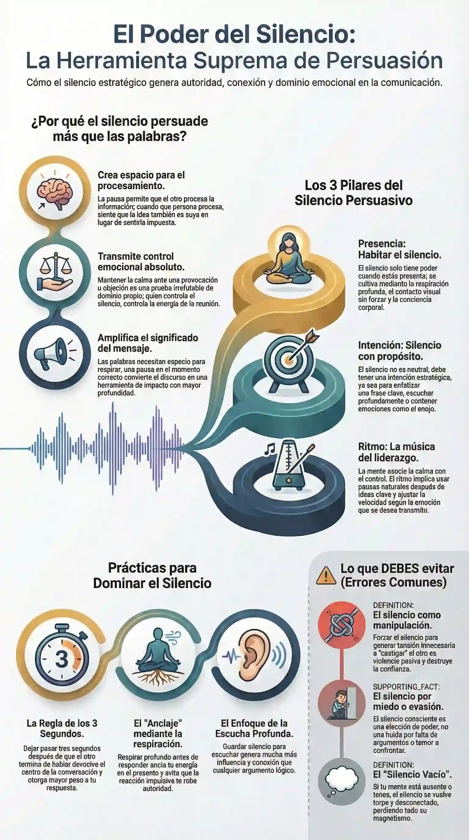 La persuasión más elegante no nace de la elocuencia de lo que se dice, sino del espacio que se deja para que el otro escuche su propia verdad. El silencio no habla a la mente consciente; habla directamente al sistema nervioso. Cuando aprendes a habitar los espacios entre tus palabras, tu mensaje deja de sonar y empieza a resonar.