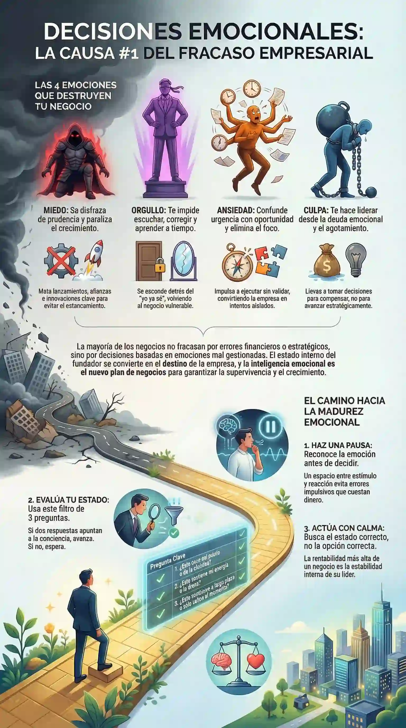 La cruda realidad es que la mayoría de las decisiones que destruyen un negocio no son financieras ni estratégicas, son emocionales. Un sorprendente 80% de los emprendimientos mueren porque sus líderes toman decisiones desde un estado interno no gestionado.