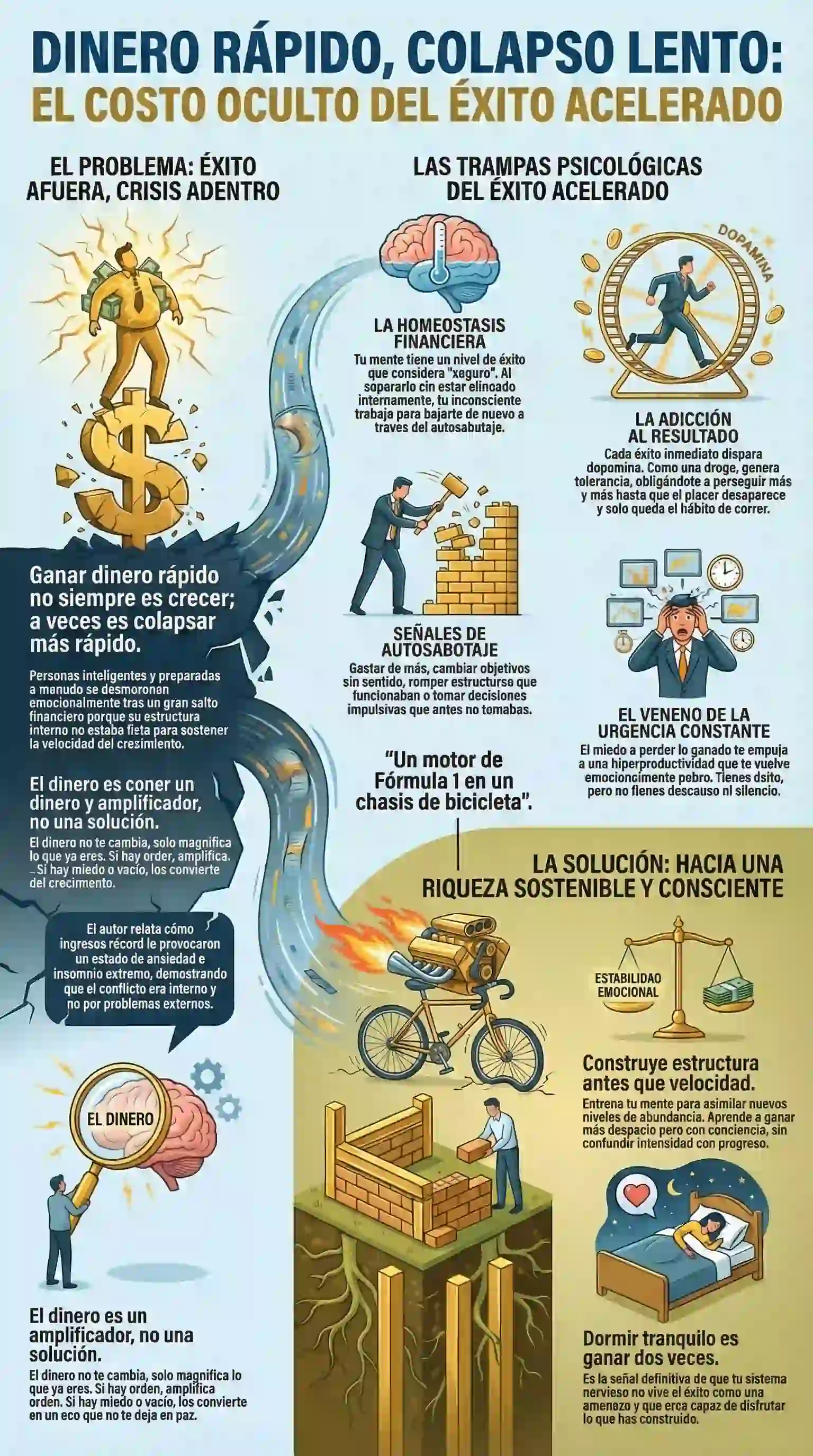 La lección final es simple pero profunda: tu crecimiento interno debe preceder o, como mínimo, acompañar a tu crecimiento financiero. La estructura es infinitamente más importante que la velocidad. El dinero sin una raíz emocional sólida se evapora, ya sea de tu cuenta bancaria o de tu capacidad para disfrutarlo.